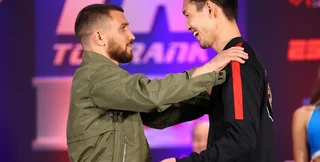 Бывший украинский чемпион Василий Ломаченко (14–2, 10 KO) провел битву взглядов перед боем с японцем Масайоши Накатани (19–1, 13 KO).