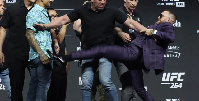 Ирландец перед началом битвы взглядов уже стал в стойку и в итоге попытался ударить американца ногой. Охранник его сдержал, но удар все-таки дошел по касательной цели.