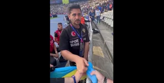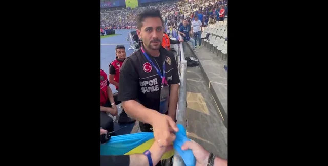Мужчина обещает прислать это видео руководству УЕФА, если ему не дадут объяснений, на что продолжает слышать только одно слово от представителей стадиона в Стамбуле: "Проблема". В конце концов мужчина признается, что он из Украины и хочет поддерживать свою страну, однако без всяких объяснений у него снова уже в более грубой форме отбирают флаг.