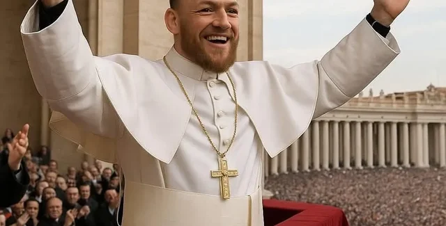 Фото, сгенерированное искусственным интеллектом, демонстрирует МакГрегора в папской одежде и с массивным крестом на теле. Конор на нем поднимает руки вверх и улыбается тысячам людей, которые заполонили площадь. К этому фото скандальный боец также добавил провокационную подпись.