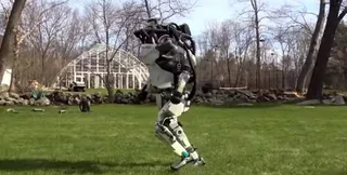 В другом видео прогулку на свежем воздухе совершает робот Atlas. Он свободно бегает по открытой местности и перепрыгивает через небольшие препятствия.
