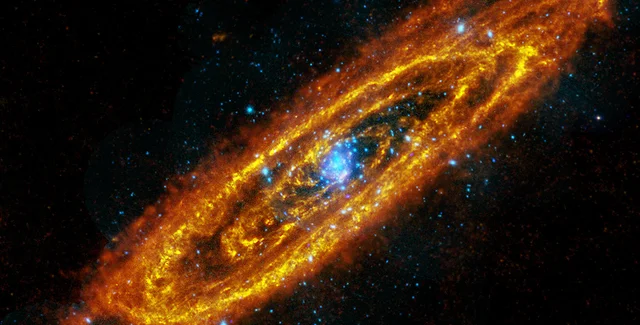 Галактика Андромеды удалена от нас на 2,5 миллиона световых лет, но является ближайшим крупным соседом Млечного пути. Предполагается, что в нее входит около триллиона звезд, тогда как в Млечном пути их 200-400 миллиардов