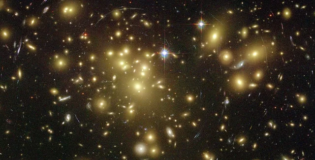 Фото галактического кластера Abell 1689, сделанное с помощью телескопа Хаббл. Ученые считают. что в кластере присутствует темная материя. Источник: NASA