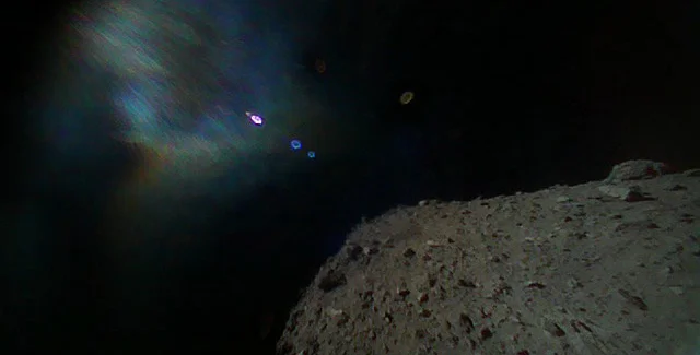 На сайте миссии опубликованы первые фото с Рюгу. Ученые объясняют, что снимки получились размытыми из-за вращения роботов и бликов солнечного света.
