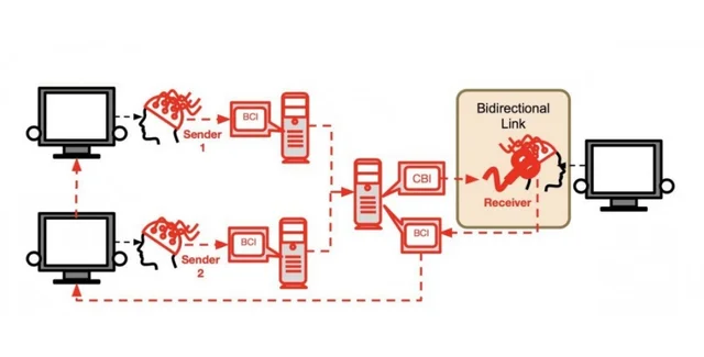 В системе из трех человек два являются отправителями: их мозговые сигналы в режиме реального времени декодируются благодаря анализу данных ЭЭГ. Третий является получателем, он принимает сигналы через ТМС-устройство.