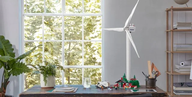 Конструктор называется Vestas Wind Turbine и включает в целом 826 деталей. В собранном виде он представляет собой моторизованную ветряную турбину примерно метровой высоты, у основания которой находятся модельки деревьев. Среди последних присутствует модель ели, которая и была сделана из экопластика.