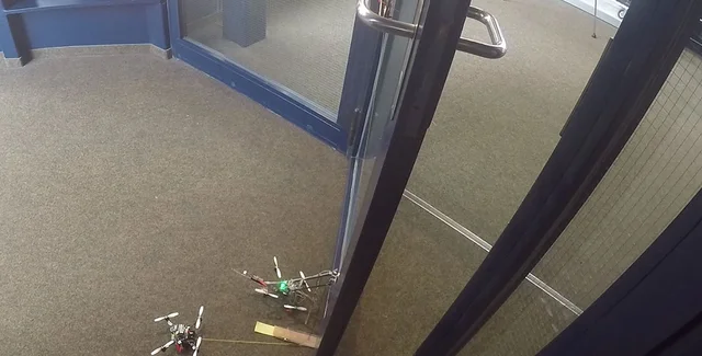 Чтобы открыть дверь, первый дрон просовывает под нее крюк и закрепляется на полу. Тем временем второй дрон цепляет крюком ручку и закрепляется на самой двери. После этого дроны одновременно начинают тянуть тросы и дверь открывается.