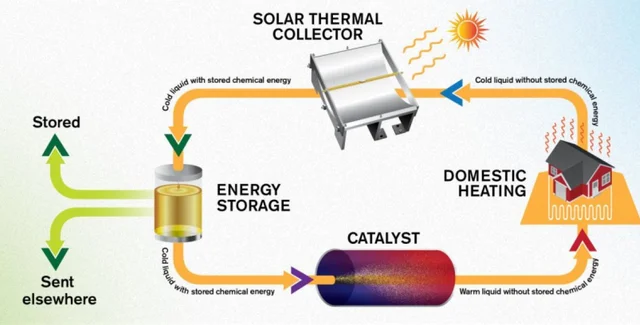 Вся система называется Молекулярным солнечным хранилищем тепловой энергии (МОСТ). Солнечный свет захватывается жидкостью через солнечный тепловой коллектор, который можно установить на крыше здания, как солнечную батарею.