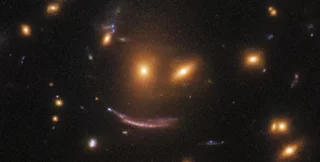 Забавный эффект получился благодаря гравитационному линзированию. Дуга улыбки - это галактика. Ее свет изогнулся из-за массивного объекта между ней и телескопом. Глаза - это еще две яркие галактики.