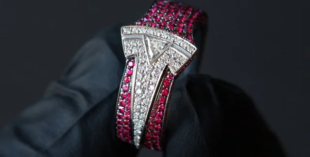 Платиновое кольцо инкрустировано рубинами и бриллиантами.