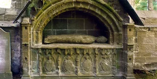Скульптуры вырезаны на задней стороне гробницы, вмурованной в стену собора