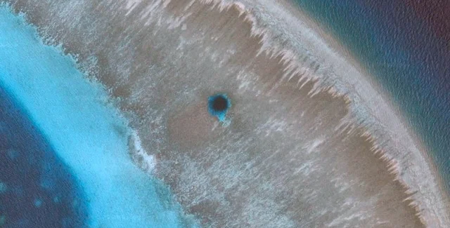Подобные голубые дыры, заполненные водой, образовались в результате эрозии горных пород.