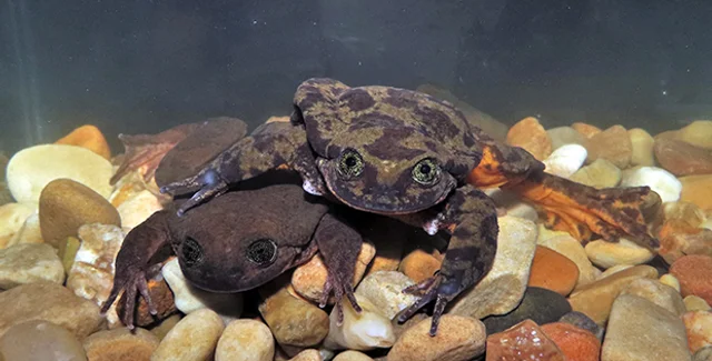На первом свидании лягушки понравились друг другу и их поселили в одном аквариуме. Они уже пытаются спариться, но пока им не удается принять нужную позу. Речь идет об амплексусе — форме псевдокопуляции у амфибий, во время которой самец обхватывает самку своими передними конечностями и оплодотворяет своей спермой икру, которую мечет самка.