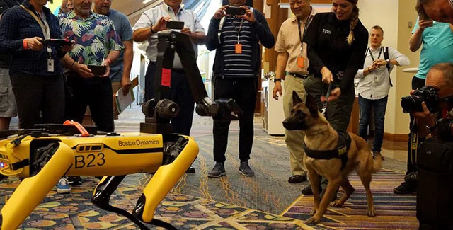 Райберт демонстрировал роботов на конференции Amazon Re: MARS в Лас-Вегасе, посвященной передовой робототехнике, машинному обучению и освоению космоса. Пара робопсов гуляла по залу под присмотром двух сотрудников Boston Dynamics, управляющих машинами с помощью модифицированных игровых планшетов.