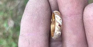 Золотое колечко лежало в 20 сантиметрах под землей. Оно украшено белой и красной эмалью, а внутри имеется надпись "любовь не предает".