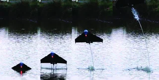 У созданного по его подобию робота есть насос, который закачивает воду в камеру с карбидом кальция. В результате химической реакции образуется горючий ацетиленовый газ, который воспламеняется, вытесняет воду и помогает роботу выскочить из воды на реактивной тяге.