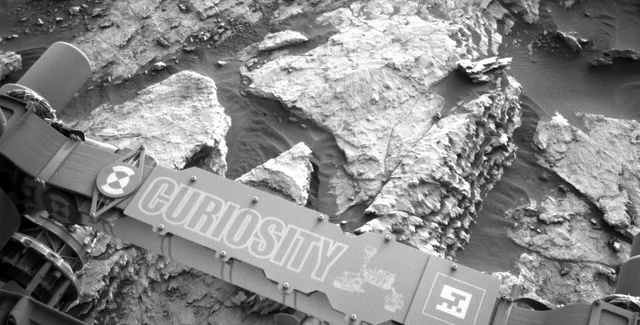 По словам ученых, марсоход изучает скалы вокруг основания горы Шарп, которая возвышается в центре кратера. Новый снимок был получен с помощью правой навигационной камеры марсохода Sol 2573 1 ноября. Так, на снимке запечатлен вид, который открывается позади Curiosity к краю кратера.