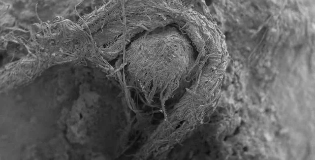 Изучение предмета под микроскопом показало, что к его нижней части прилип крошечный кусочек нити, длиной всего 6 мм и шириной – 0,5 мм. Нить была изготовлена путем скручивания волокон против часовой стрелки, далее три пучка скрутили вместе по часовой стрелке, чтобы получить трехслойную нить.