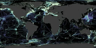На представленное карте черным цветом отмечены те области, где еще предстоит провести эхолотные измерения формы дна океана (на заглавном фото). Оттенки синего цвета показывают глубину – самые глубокие места обозначены фиолетовым, а более мелкие – голубым.