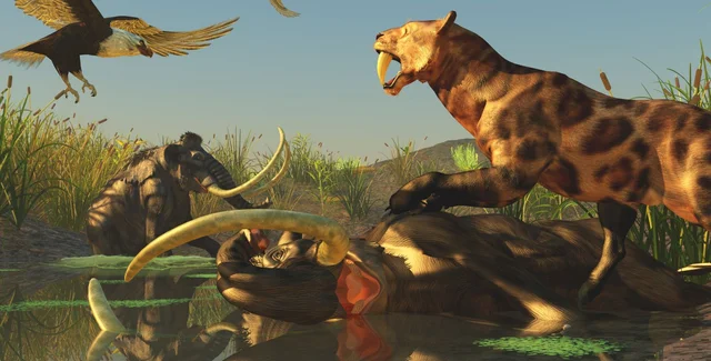 Один из самых знаменитых и распиаренных видов вымерших животных. Кстати, они не тигры и размеров были не тигриных, большинство видов не было больше метрового оцелота. Длина зубов этих "мурок" достигала 20 см, что позволяло хищникам одновременно перегрызать сонную артерию и трахею у поверженной на землю добычи. И, тем не менее, саблезубые проиграли эволюционную битву кошкам с коническими зубами. Практически у любого домашнего любимца вы обнаружите верхние клыки более или менее конической формы. Его предки выдержали невероятную конкуренцию в период плиоцена.