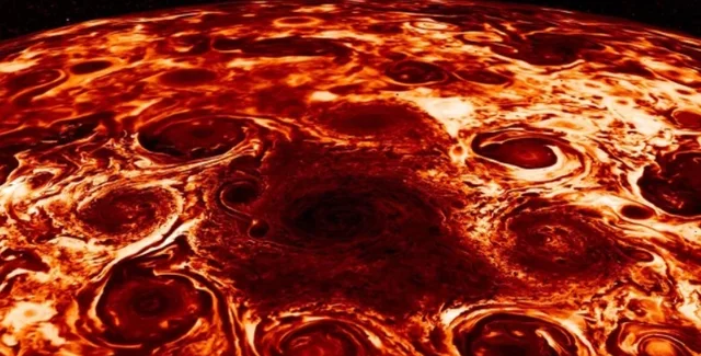 После того, как в 2016 году зонд NASA Juno вышел на орбиту Юпитера, космический аппарат обнаружил гигантские циклоны, расположенные в геометрической форме вокруг полюсов планеты. На северном полюсе планеты находится восемь вихрей и один центральны, а на южном – шесть.