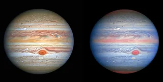 Изображение, сделанное 25 августа, объединяет данные в ультрафиолетовом, видимом и ближнем инфракрасном диапазонах. Таким образом, ученые получают лучшее представление о массивной атмосфере газового гиганта.