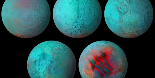 На полученном инфракрасном снимке Энцелада можно увидеть, как "тигриные полосы" светятся на поверхности ярким красным светом. Эффект говорит о том, что относительно недавно на поверхности луны образовался пресноводный лед. Ученые предполагают, что вода вырвалась на поверхность из подземных океанов.
