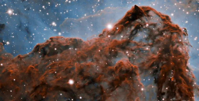 Астрономы изучают туманность Киля, чтобы больше узнать о звездообразовании. Новое изображение показывает "замысловатый танец" светящегося газа и пыли на западной стене по краю туманности. Его удалось получить при помощи уникальной особенности телескопа - адаптивной оптики.