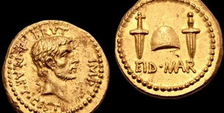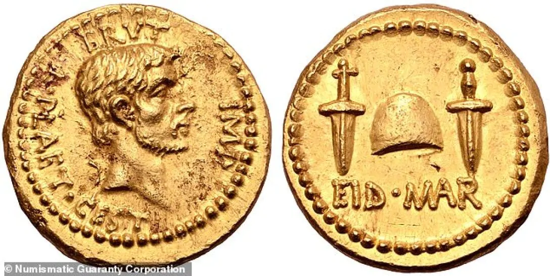 Монета была изготовлена спустя два года после убийства Юлия Цезаря 60 римскими сенаторами. Всего, считают эксперты, существовало около ста подобных монет. Часть была отчеканена из серебра, часть из золота, современники описывали их чеканку, как "открытое и бессовестное" празднование смерти Юлия Цезаря.