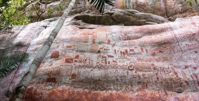 Картина была нарисована охрой, которую в древности часто использовали в качестве краски. Череда различных рисунков раскинулась на скалах над тремя пещерами в колумбийской Амазонии.