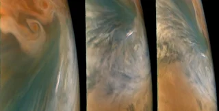 Два больших северных циклона Юпитера отчетливо видны на снимках JunoCam, сделанных с высоты 28 567 км над облачным покровом газового гиганта. Внешние облака цилона вращаются против часовой стрелки, но внутренние облака вращаются по часовой стрелке, что "довольно странно", отмечает разработчик JunoCam Кэндис Хансен.