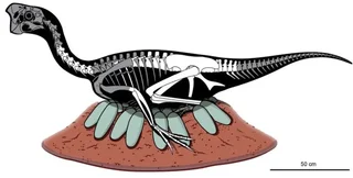 Кладка яиц возрастом 70 млн лет принадлежит взрослому овираптору среднего размера, который является частью окаменелости. Скелет этого страусоподобного теропода "сидит" на корточках над кладкой яиц, часть из которых была готова вылупиться и все еще содержит эмбрионы внутри.