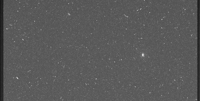 Снимок был сделан на 73 марсианский день пребывания марсохода на планете. На нем видны звезды и следы тяжелых заряженных частиц. А яркое пятно в правой части снимка, вероятно, является спутником Марса Фобосом.