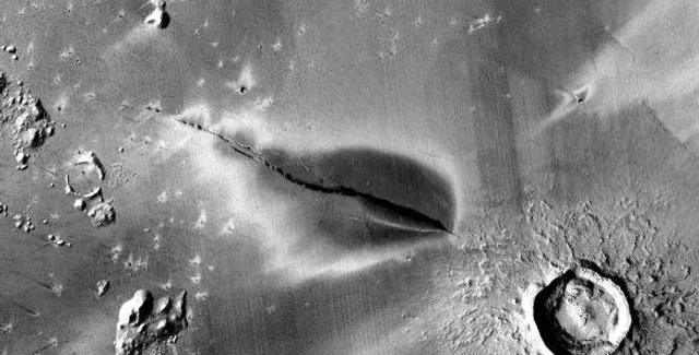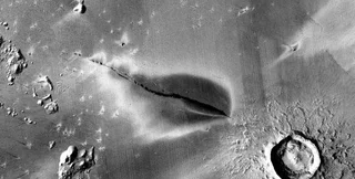 "Это загадочные темные отложения, занимающие территорию немного больше, чем Вашингтон. Они имеют высокую тепловую инерцию, включает в себя богатый пироксеном материал с высоким содержанием кальция и симметрично распределены вокруг участка системы трещин Cerberus Fossae в Elysium Planitia, которая нетипична для эоловых или ветряных отложений в этом регионе. Это похоже на темные пятна на Луне и Меркурии, которые, возможно, являются взрывными вулканическими извержениями", — сказал Хорват. "Это может быть самое молодое вулканическое отложение из когда-либо зарегистрированное на Марсе. Если бы мы сжали геологическую историю Марса в один день, это произошло бы в самую последнюю секунду".