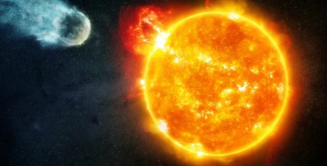 Однако мощные вспышки, подобные тем, о которых говорят ученые, повторяющиеся на протяжении сотен миллионов лет, могут разрушить любую регенерированную атмосферу на каменистых планетах в обитаемой зоне. На иллюстрации показана атмосфера каменистой планеты, уносимая влево энергетическим излучением от вспышек, произведенных красным карликом. Это уменьшает вероятность того, что в этих мирах может быть жизнь. В настоящее время ученые изучают высокоэнергетическое излучение многих других красных карликов, чтобы определить, является ли звезда Барнарда типичной.