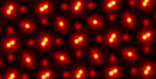 Исследователи получили изображения атомов в кристалле ортоскандата празеодима (PrScO3) с увеличением в 100 миллионов раз. Атомы отчетливо видны как яркие точки, окруженные красными "облаками", которые, по мнению ученых, размываются из-за покачивания самих атомов.