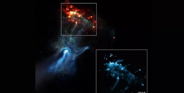 Этот пульсар создал вокруг себя пузырь из энергичных частиц, который в сочетании с обломками, оставшимися после взрыва сверхновой, создал структуру, похожую на руку, протяженность которой составляет 150 световых лет. Тем временем светящаяся структура, к которой она стремится, — это гигантское газовое облако, известное как RCW 89.