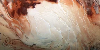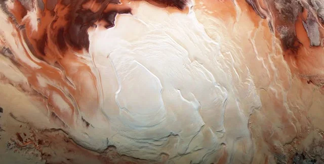 Радиолокационные сигналы, первоначально интерпретированные как жидкая вода, были обнаружены в районе Марса, известном как Южнополярные слоистые отложения, названном так из-за чередующихся слоев водяного льда, сухого льда (замороженного углекислого газа) и пыли, которые осели там за миллионы лет. Считается, что эти слои отражают изменение наклона оси Марса с течением времени, точно так же, как изменения наклона Земли создавали ледниковые периоды и более теплые периоды на протяжении всей истории нашей планеты. Когда у Марса был меньший осевой наклон, в этом регионе аккумулировались снег и слои пыли, которые в конечном итоге сформировали толстый слоистый ледяной покров.