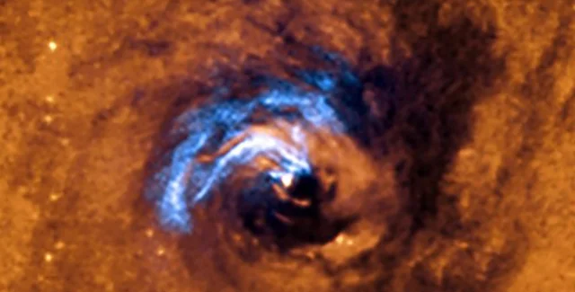 Комбинированные изображения показывают снимок, на котором можно увидеть, как пылевые волокна разделяются, а затем идут прямо к центру галактики. Какое-то время пылевые нити кружат вокруг черной дыры, прежде чем окончательно проглотят.