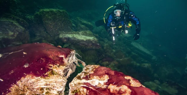 Аквалангист наблюдает за фиолетовыми, белыми и зелеными микробами, покрывающими скалы в провале Мидл-Айленде на озере Гурон.