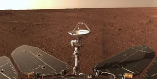 Шестиколесный марсоход на солнечной проделал путь длиной в 1064 метра с момента своего спуска на поверхность Марса 22 мая этого года. Готовясь к перерыву в работе марсоход сделал с помощью своей камеры фотографии окрестностей.