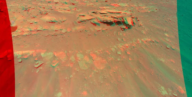 Этот 3D-вид, который лучше всего просматривается в красно-синих очках, был создан путем объединения данных двух изображений, сделанных на расстоянии 5 м друг от друга цветной камерой на борту Ingenuity.