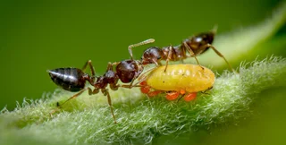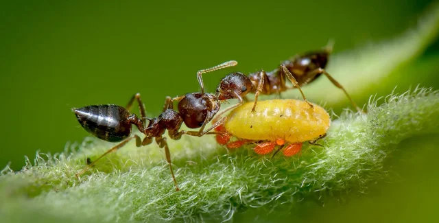Здесь показаны мутуалистические отношения между муравьем и тлей. Муравьи поедают нектар, выделяемый желтой тлей, а взамен муравьи защищают тлю от других организмов, таких как красные клещи.