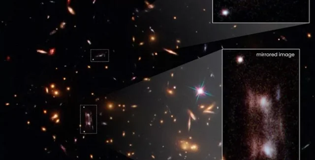На снимке Хаббла две галактики выглядят как зеркальные отражения друг друга. Когда астрономы впервые увидели изображения в 2013 году, они сразу же предположили, что стали свидетелями гравитационного линзирования. Это явление происходит, когда свет от удаленного объекта искажается, под действием гравитации чего-то еще, что находится между этим объектом и наблюдателем.