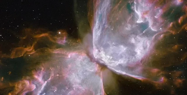 На этом изображении показана умирающая звезда в центре изящных "крыльев бабочки", которые созданы из газа, нагретого до 20 тысяч градусов Цельсия.