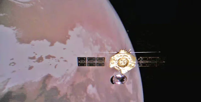 На двух фотографиях полностью или частично запечатлен орбитальный аппарат миссии, который помогает поддерживать связь между Землей и зондом, расположенным на поверхности Марса. Первая в своем роде фотография, на которой орбитальный аппарат полностью изображен, была сделана с помощью камеры. Ее зонд сам выпустил в космос.
