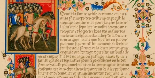 Страница рукописи с изображением боевых коней в крестовых походах на старофранцузском языке | Фото: The Guardian
