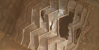 Поэтому не удивительно, что шины роверов время от времени повреждаются. Учитывая неровную поверхность Марса — сухую, плотно утрамбованную почву, валуны и неровный рельеф, износ колес марсохода неизбежен.