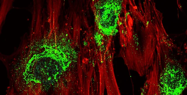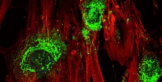 Стволовые клетки, которые превращаются в костные клетки под микроскопом. Зеленым цветом показан коллаген, который клетки производят как побочный продукт процесса