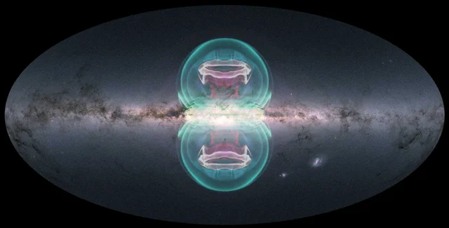 Чтобы лучше понимать эти размеры, представьте, что наш Млечный Путь имеет диаметр 30 килопарсек, а Солнечная система находится примерно в 8 килопарсеках от центра галактики. Ученые считают, что пузыри eRosita примерно в два раза больше пузырей Ферми.